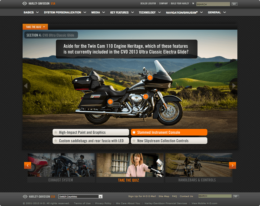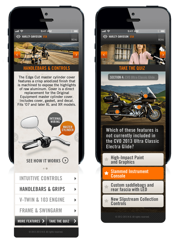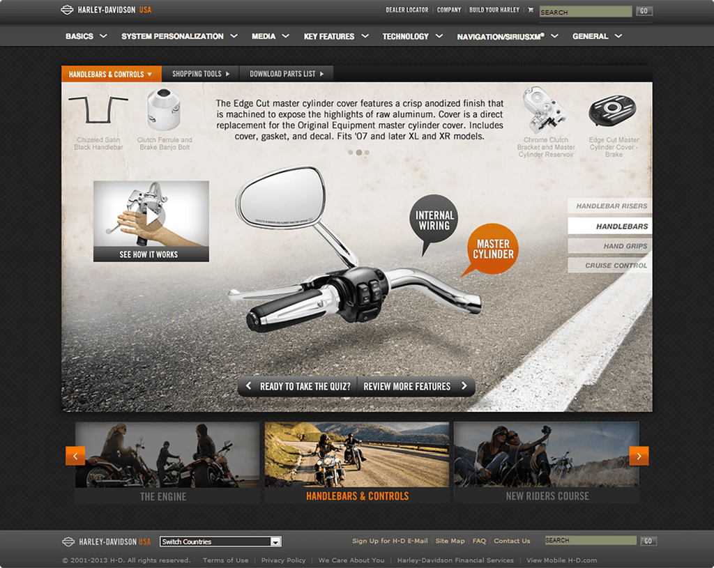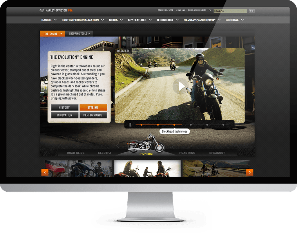 After proving the approach worked for the infotainment system, we explored how we could evolve the platform into a full brand experience, connecting product education, motorcycle features, and Harley’s rich heritage into a single digital hub.